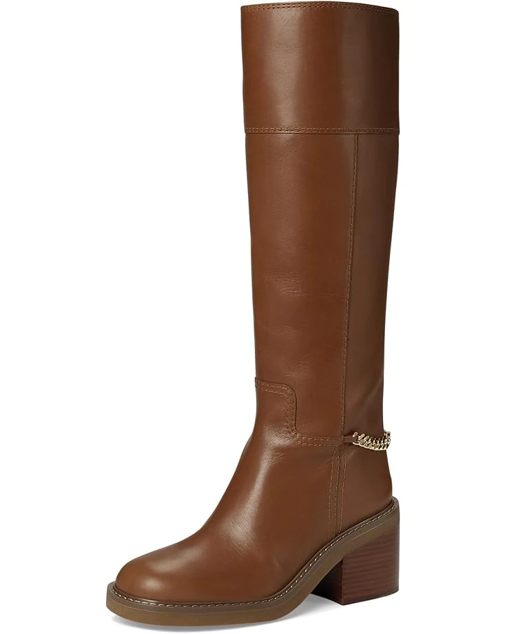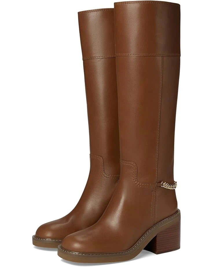 - The MICHAEL Michael Kors® Carlisle Boots are contemporary knee-high boots with interior double pull tabs on stacked chunky block heels. Featuring a refined and modern take on heritage styling, these tall boots are elevated with a metal Empire ID chain on the heel. The leather upper, synthetic insole, and polyester lining make them comfortable and durable. Walk with style and confidence wearing these pull-on leather boots.