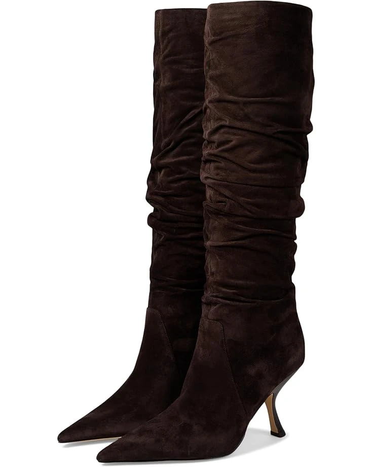 - Point toe pull on to-the-knee statement boot with fashionable kicked-in heel design. Satin lining is smooth on the leg and allows for the soft slouch effect.