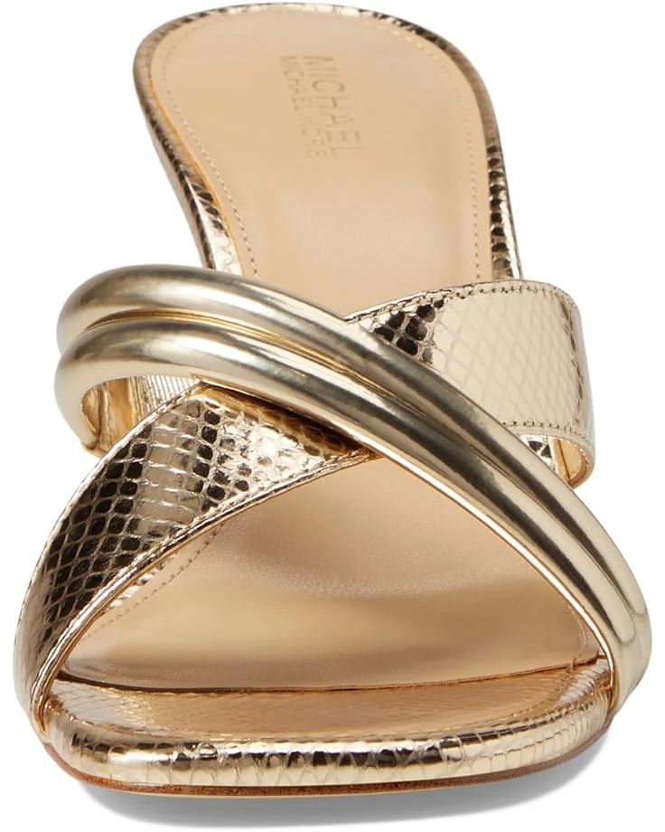 - Add a stunning touch to your look by wearing the MICHAEL Michael Kors® Nadina Mule Wedge. The slip-on style heels have an open-round toe and sculptured galvanized wedge with a bombe strap crossing over an embossed snake strap. The cushioned heels have a leather upper, faux leather lining, and synthetic insole for added comfort and longevity.